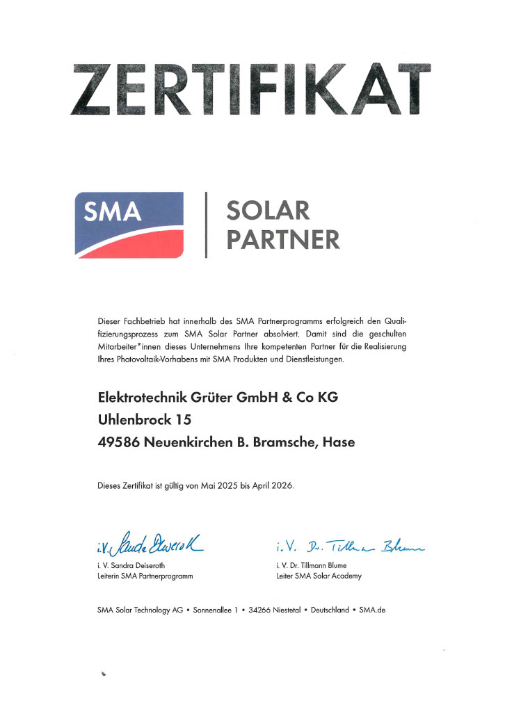 Andreas Lührmann14 Februar 2024Trustindex überprüft, ob die Originalquelle der Bewertung Google ist. Sehr gute Mitarbeiter , zuverlässige Betreuung bei unseren Anlagen Heinrich Jasper8 Februar 2024Trustindex überprüft, ob die Originalquelle der Bewertung Google ist. Diese Woche eine PV Anlage mit Speichern bekommen. Von Anfang bis Ende alles gut und schnell umgesetzt. Michael Waldhaus21 November 2023Trustindex überprüft, ob die Originalquelle der Bewertung Google ist. Top zufrieden Kann ich nur weiterempfehlen! Zwei Gaspedale28 Oktober 2023Trustindex überprüft, ob die Originalquelle der Bewertung Google ist. Wir hatten uns bewusst für die Firma Grüter entschieden, als der Wunsch nach einer PV-Anlage konkreter wurde. Vom ersten Informationsgespräch über die individuelle Planung mit durchgängiger Betreuung durch Hrn. Ivanov bis hin zur tatsächlichen Umsetzung und Inbetriebnahme sind wir stets sehr zufrieden gewesen. HERZLICHEN DANK an Hrn. Ivanov und das gesamte ETG Team. Wir werden Sie und Euch wärmstens weiterempfehlen. Familie Asselmeyer Rene Vornheder7 Juni 2023Trustindex überprüft, ob die Originalquelle der Bewertung Google ist. Eine Firma der Spitzenklasse ! Von der Planung bis zur Fertigstellung TOP ! Sehr freundliche und kompetente Mitarbeiter! ! Kann man einfach nur weiterempfehlen ? michael wissmann26 April 2023Trustindex überprüft, ob die Originalquelle der Bewertung Google ist. Wir haben uns mit dem Wunsch einer PV Anlage inklusive einer Wallbox mit Überschussladen an die Firma Grüter gewandt. Und sind mehr als zufrieden.?? Von der Beratung über die Planung/Auftragsabwicklung und Montage hat alles reibungslos geklappt. Die Anlage läuft fehlerfrei und das Laden unserers E Autos klappt prima. Besonders möchte ich Herrn Wiesmann hervorheben. In seinem Alter ein mehr als angenehmer Elektroinstallateur. Er sticht durch Kompetenz und erfrischender Freundlichkeit hervor. Unsere Erwartungen wurden übertroffen, gut wir haben auch den ganzen Tag ? Die PV Anlage liefert super. Wir würden uns jederzeit wieder an die Firma Grüter wenden. Vielen Dank für diese tolle Anlage. Madleen Abing19 November 2022Trustindex überprüft, ob die Originalquelle der Bewertung Google ist. Mega cooles Praktikum gehabt. Nettes Team und schöne Firma. Habe mich mit jedem gut verstanden, Viel Spaß gehabt und viel gelernt.