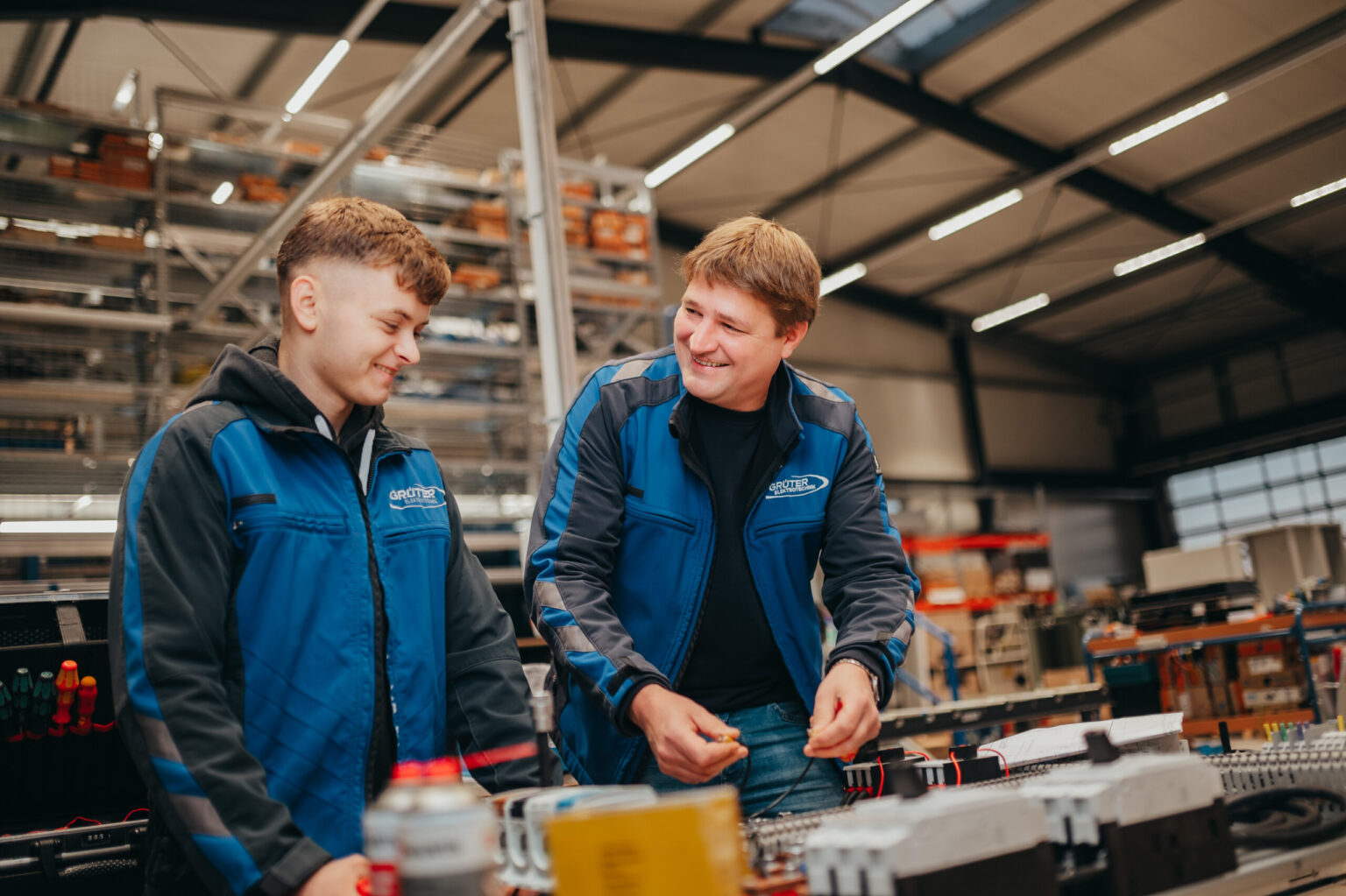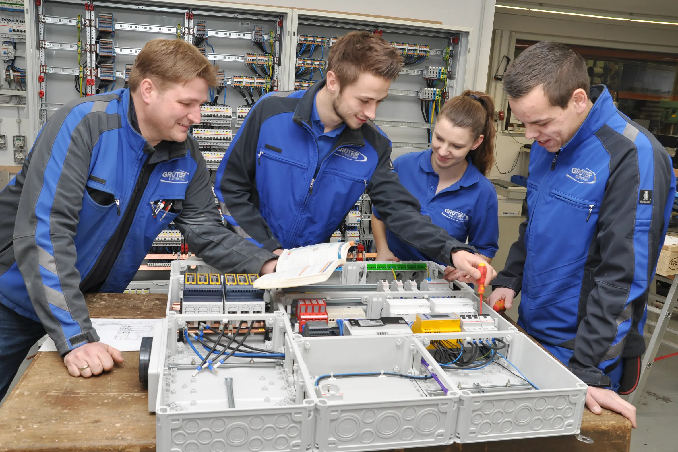 Bei GRÜTER lernst du das Elektriker-Handwerk von Grund auf. Daher haben wir eine eigene Ausbildungswerkstatt geschaffen – da kannst du dich mit den anderen Azubis austauschen und ausprobieren. In deinem Lehrjahr sind bis zu 3 weitere Auszubildende, die zusammen mit dir die Lehre absolvieren. Natürlich sind unsere Gesellen und Meister für dich da und zeigen dir, wie es funktioniert und worauf es ankommt.